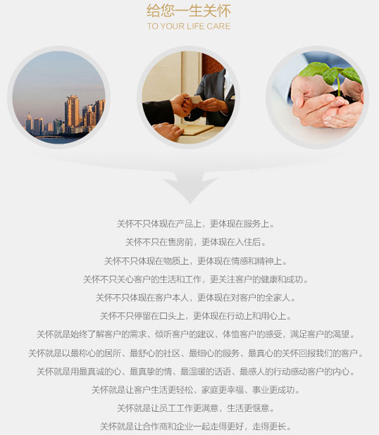 關(guān)懷:我們將以優(yōu)良的產(chǎn)品和服務(wù)回饋客戶、以實(shí)現(xiàn)個(gè)人價(jià)值的發(fā)展平臺(tái)回報(bào)員工、以良好的利益共享前景回敬合作商、以奉獻(xiàn)傳世作品和創(chuàng)造城市價(jià)值回贈(zèng)社會(huì)。