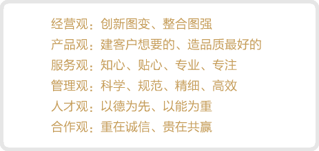引領(lǐng)人居進(jìn)程:為不斷改善和提升民眾居住質(zhì)量,我們將始終如一、不遺余力的努力探索和用心創(chuàng)造適合居住的生活新模式,成為新生活的倡導(dǎo)者和規(guī)劃者、引領(lǐng)人們的生活真正進(jìn)入一個(gè)詩意人居的理想境界。